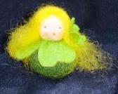Das kleine Glückskleekind ist ca 6 cm groß und hat einen dunkelgrünen Bauch. Vier hellgrüne Kleeblätter sind um den Hals befestigt. Der Kopf ist aus Triokot und Märchenwolle. Die Augen sind aufgestickt.